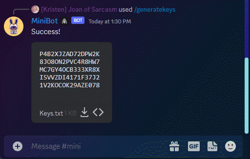 The admin commands the bot generate a 16-digit alphanumeric key that is assigned to a particular Discord role.