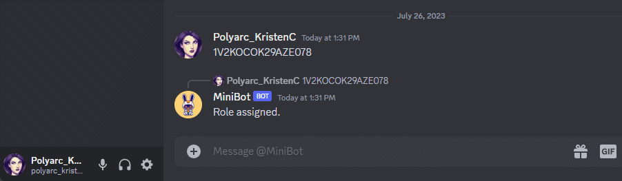 A player messages the bot with the key. The bot grants the player the role associated with that key.
